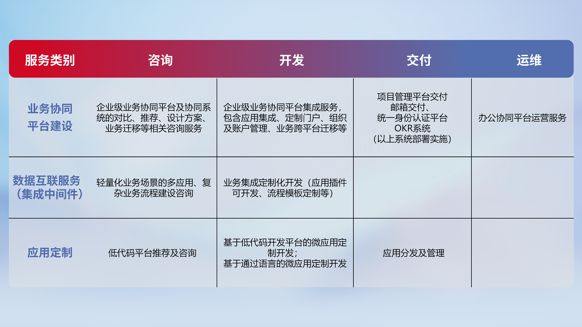 针对钉钉、、、企微、、IDaas等平台级产品提供产品的规划、、方案、、、、交付、、定制化开发等服务,,,实现如统一协同办公、、、智能客户服务、、、混合会议管理、、智能数据查询、、等业务场景,,,实现数字化转型。。
